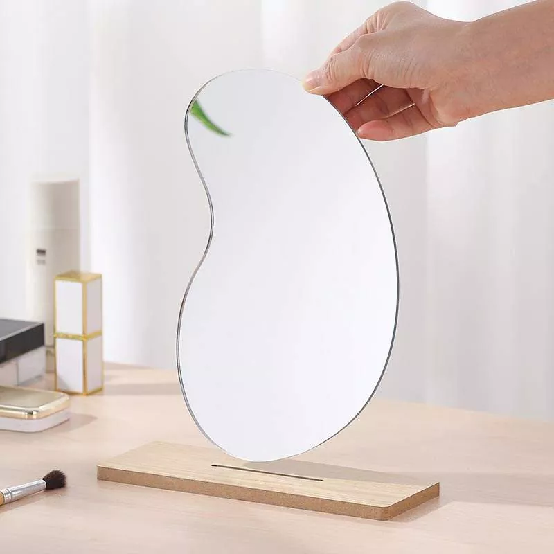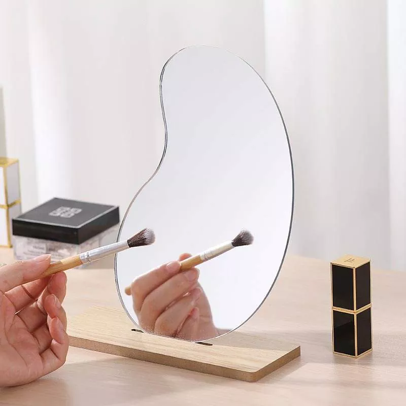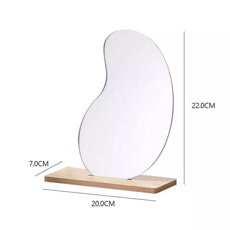 Това неправилно вълнообразно настолно огледало се отличава с минималистичен, артистичен силует, който се слива безпроблемно с модерния домашен декор. Изработен от прозрачно стъкло с висока разделителна способност и гладка дървена основа, той осигурява отражение без изкривяване, идеално за нанасяне на грим, рутинни грижи за кожата и ежедневна грижа.