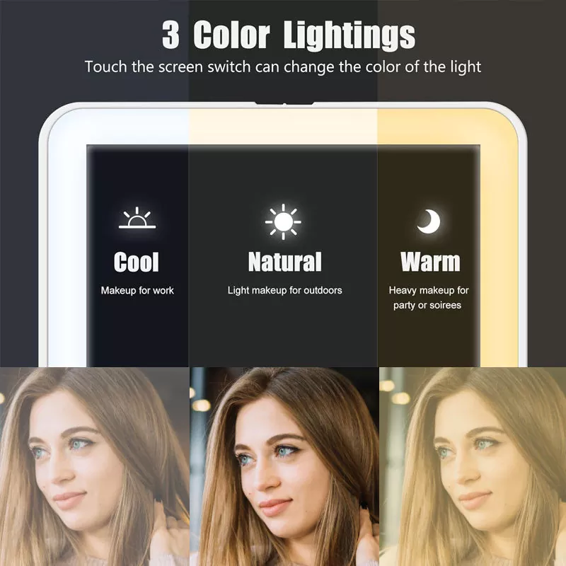 Това настолно LED огледало за грим разполага с три регулируеми режима на осветяване (студено, естествено, топло), за да отговаря на всички сценарии за грим. Студената светлина е идеална за работен грим, естествената светлина за външен вид и топлата светлина за вечерни събития. Мекият LED пръстен без трептене осигурява реалистично цветопредаване, гарантирайки прецизно нанасяне на грим дори в тъмна среда.